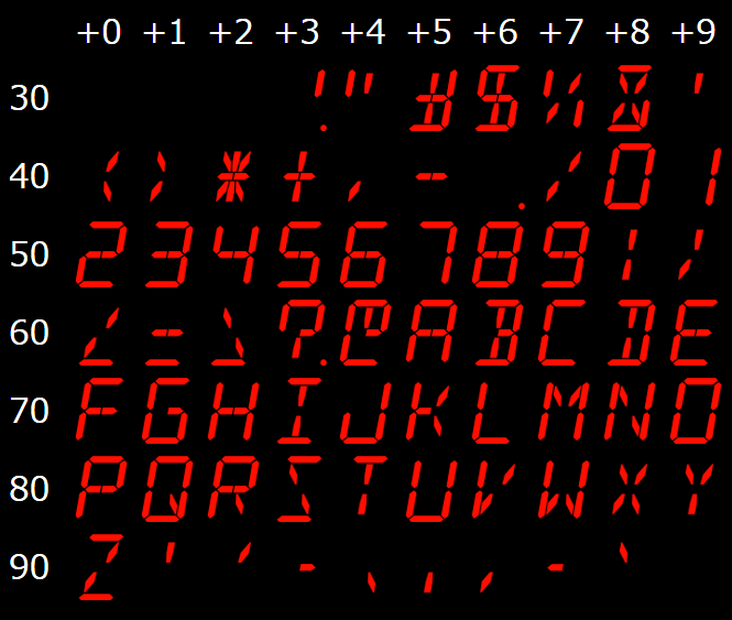 見ればすぐにわかると思いますが、ASCIIコードの並びです。0~99までが文字コードとして定義されていますが、0~32と99はブランク(空白)です。